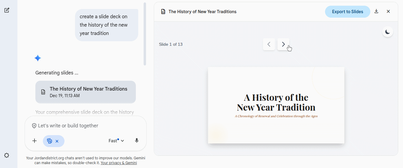 Google recently introduced the ability to create slide presentations in Gemini through the Canvas tool. Provide an idea with a text prompt or upload a source, and Gemini will generate a set of slides — complete with a theme and relevant images. Then, export the presentation from the Gemini app directly to Google Slides to continue to refine or collaborate with others.