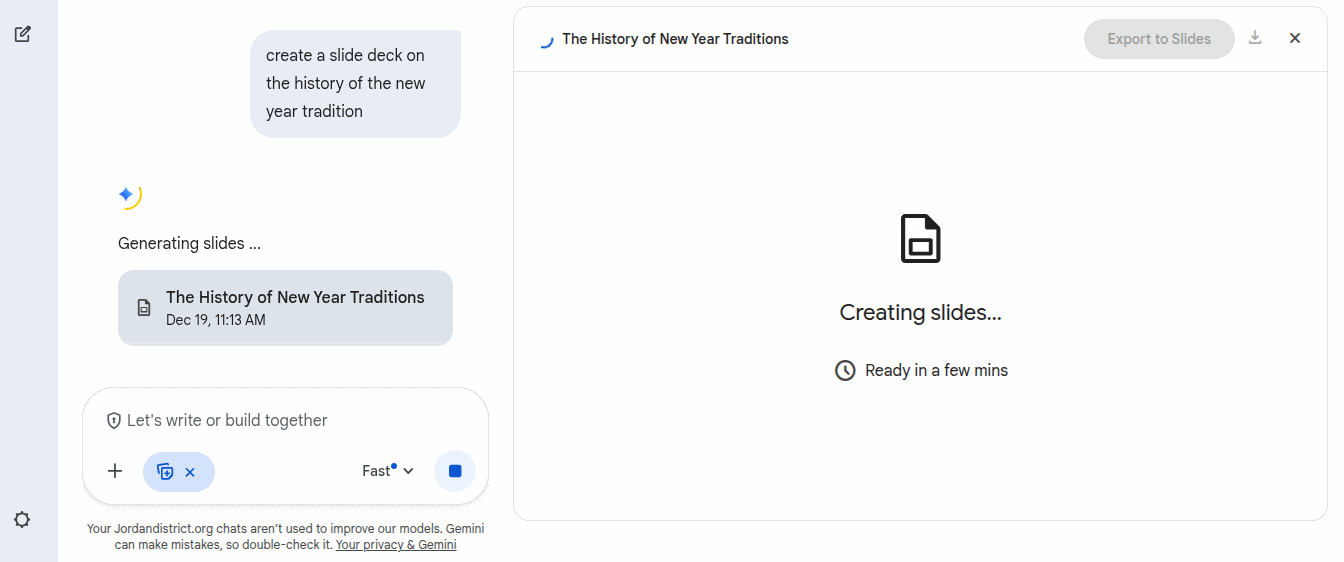 Google recently introduced the ability to create slide presentations in Gemini through the Canvas tool. Provide an idea with a text prompt or upload a source, and Gemini will generate a set of slides — complete with a theme and relevant images. Then, export the presentation from the Gemini app directly to Google Slides to continue to refine or collaborate with others.
