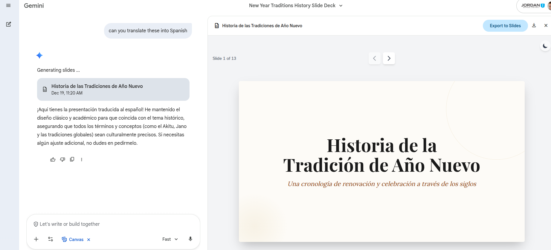 Bonus- you can use Gemini to translate the same slides into different languages! For more information, read more on the Google Workspace Updates Blog.